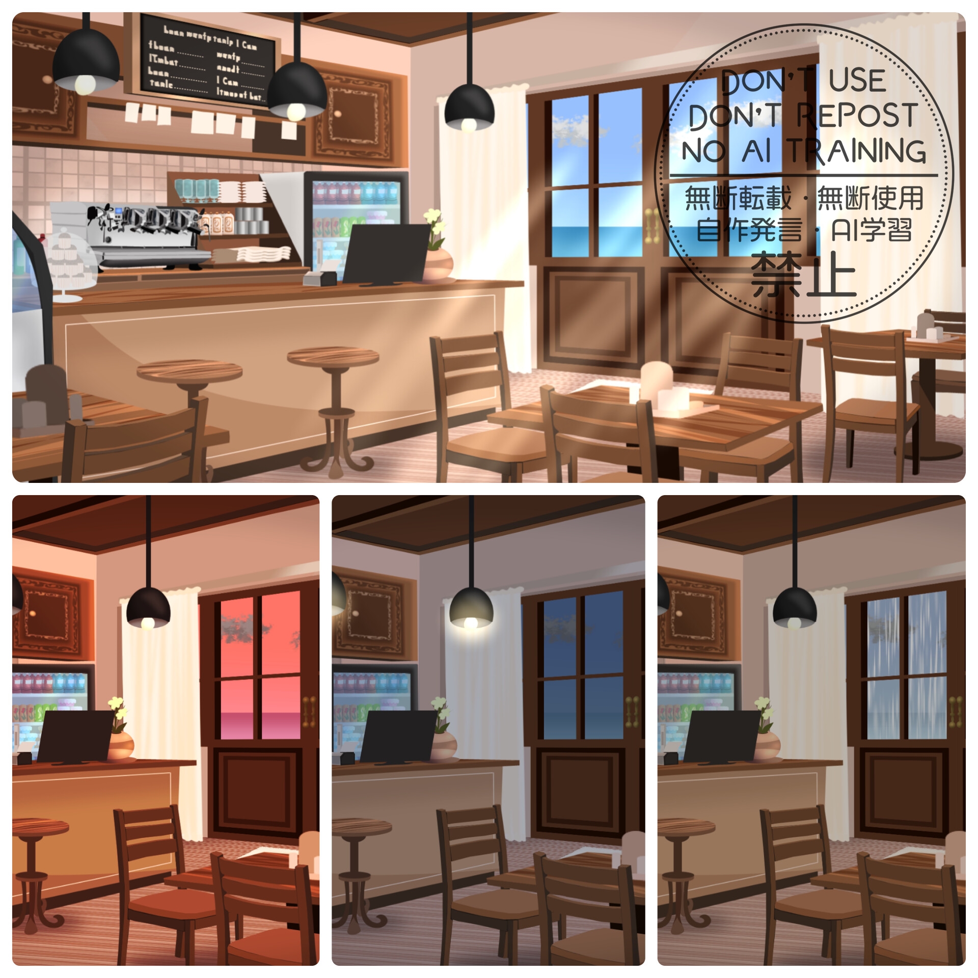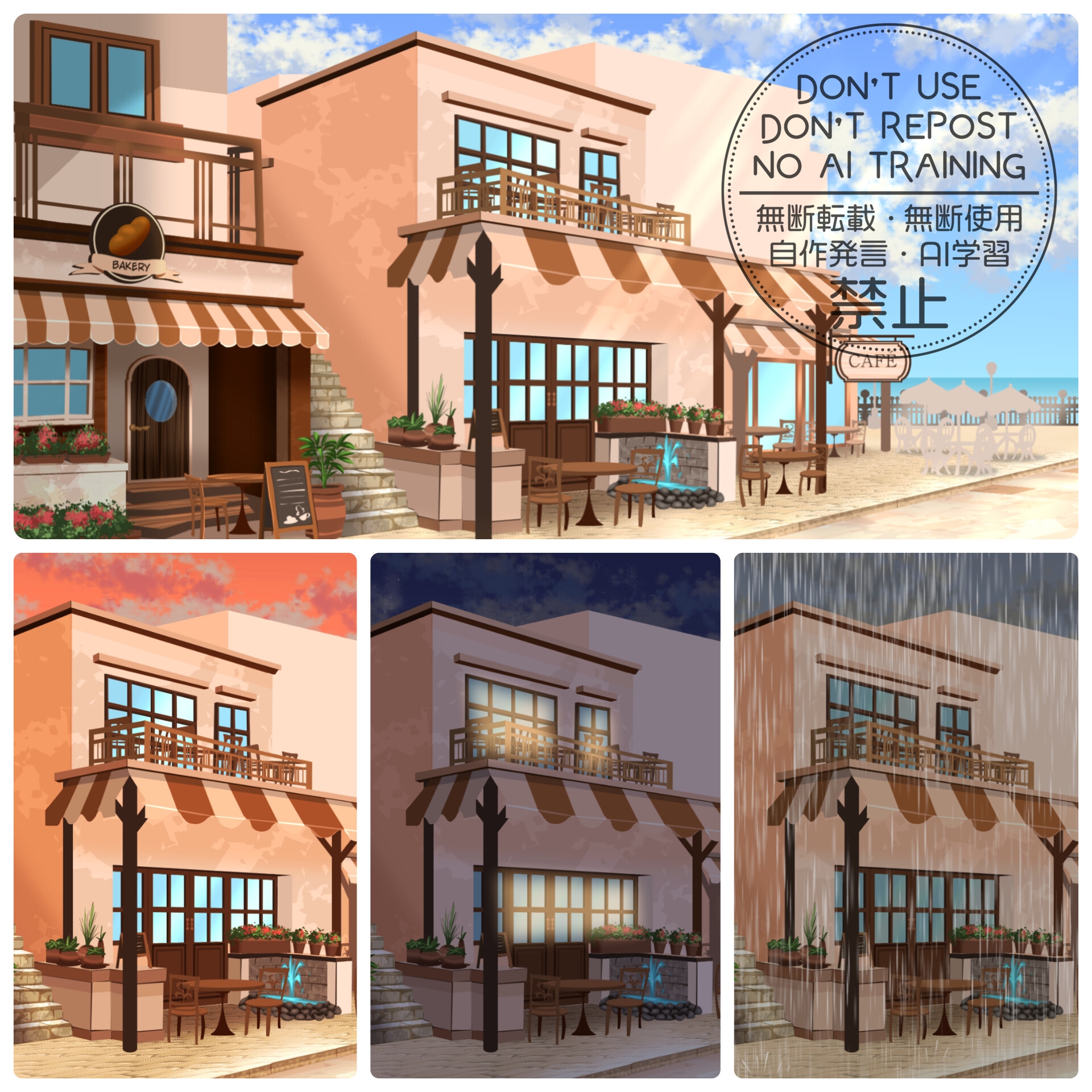 Includes two illustrated backgrounds: exterior and interior; each with four variations: day, afternoon, night, and rain. All in 1920x1080 px.